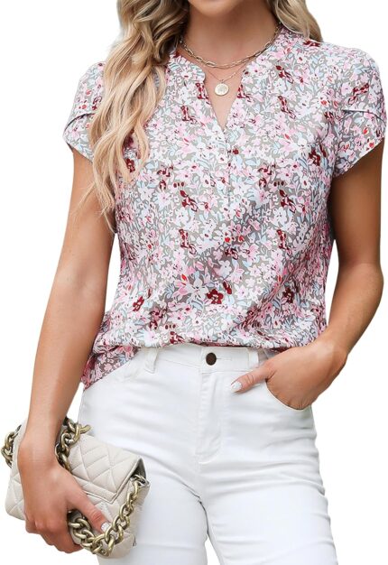 Blooming Jelly Women’s Dressy Casual Tops Business Work Blouses White Button Down Shirts Cap Sleeve V Neck Tshirt