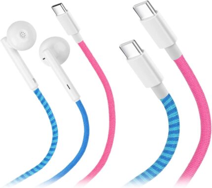 URIZON 2-Pack Braided USB-C Earphones, Colorful Earbuds with Mic & USB-C PD Charging Cable – 2 Hours Full Charge, Suitable for Huawei, Xiaomi