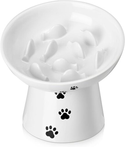 Y YHY Pet Feeder, Ceramic Cat Slow Feeder Bowl, 6 Inches, Elevated, Anti Vomiting for Dry and Wet Food, White