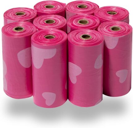 Best Pet Supplies Dog Poop Bags (150 Bags) for Waste Refuse Cleanup, Doggy Roll Replacements for Outdoor Puppy Walking and Travel, Leak Proof and Tear Resistant, Thick Plastic – Pink Heart
