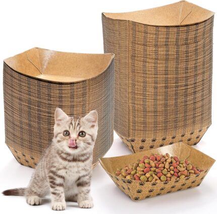 SOUJOY 100 Pack Disposable Pets Feeding Bowls, 2 lb Paper Travel Cat Food Bowl, Boat Foot Print Design Food Serving Trays for Wet and Dry Food, Small Dog Puppy, Cat