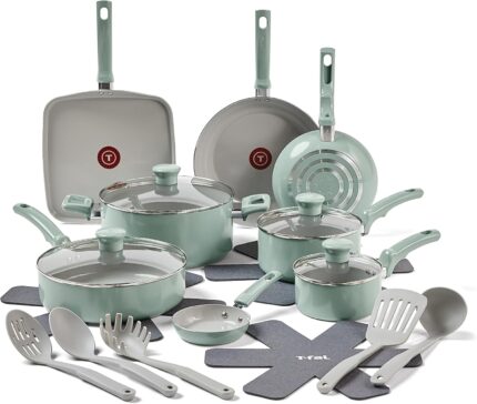 T-fal Refresh Ceramic, Ceramic Non Stick Cookware Set 20 Piece, Oven Broiler Safe 350F, Kitchen Set w/Egg Pan, Fry Pans, Saucepans, Griddle, Sautepan, Dutch Oven & Utensils, Pots, Pans, Mint Green