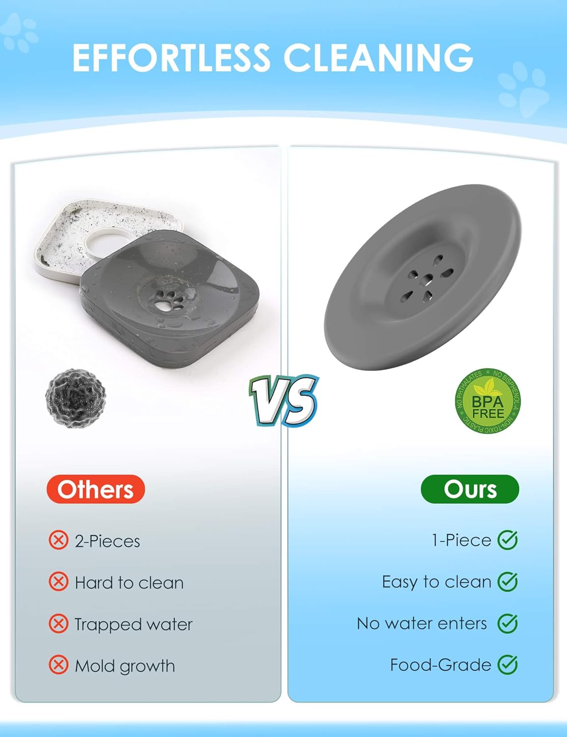 【One Piece Molded Floating Disk】Besides lid, the bowl also goes with a floating disk to slow down water drinking, also helps prevent dust, dirt, and pet hair from falling into the water. What’s more, it is an upgraded one piece molded floating disk, no water seepage, never get moldy or dirty, no need to pry open for cleaning.