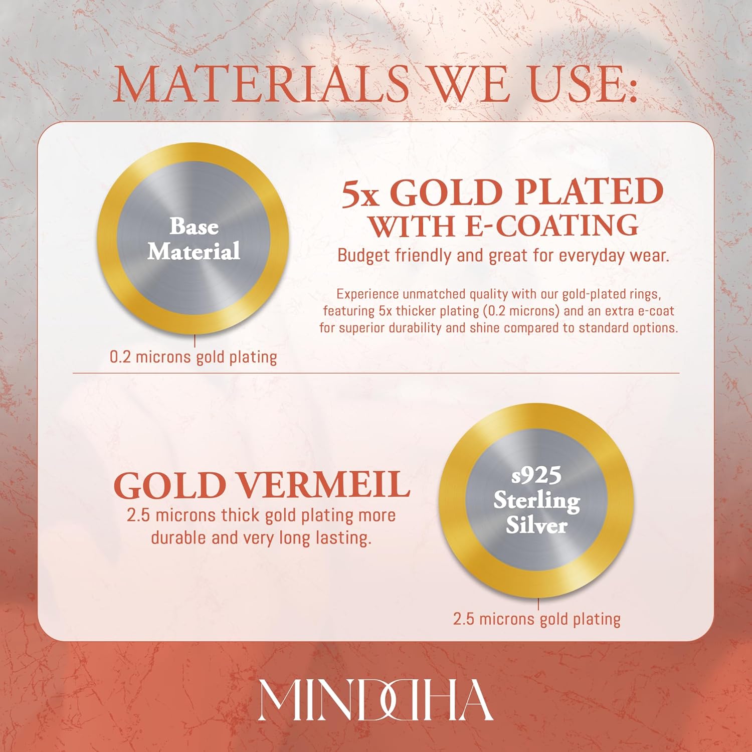 Our rings feature a gold plating layer that is five times thicker than the industry standard. This thicker layer not only provides a richer, more luxurious appearance but also enhances the durability of the ring, ensuring it withstands everyday wear and tear much better than thinner gold coatings.