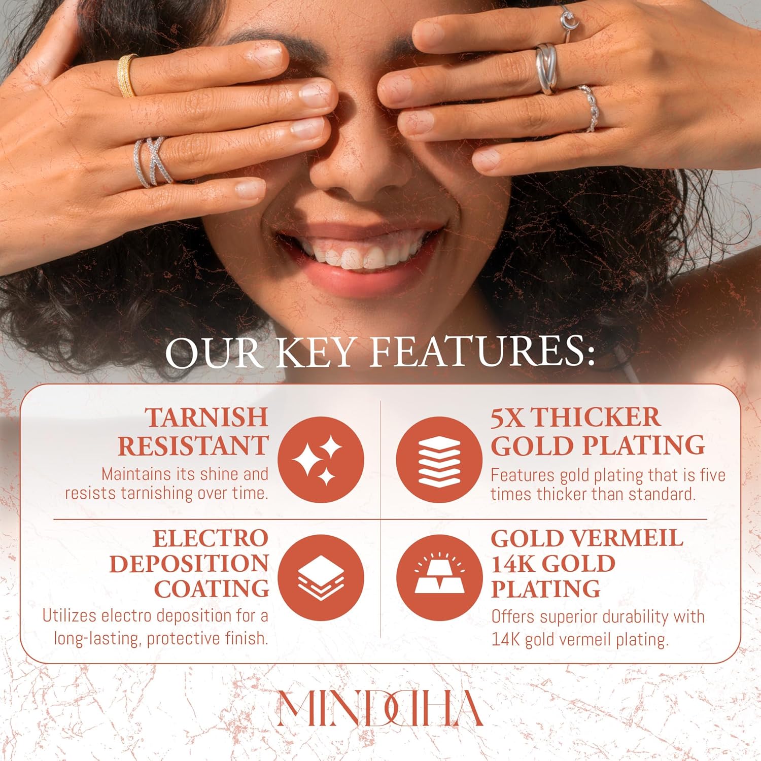 Our rings are plated with gold vermeil 14k gold, offering superior durability and a truly luxurious look. The thicker gold layer in vermeil is more resilient than standard gold plating, providing a lasting finish that stands up to daily wear while maintaining its elegant shine and color.