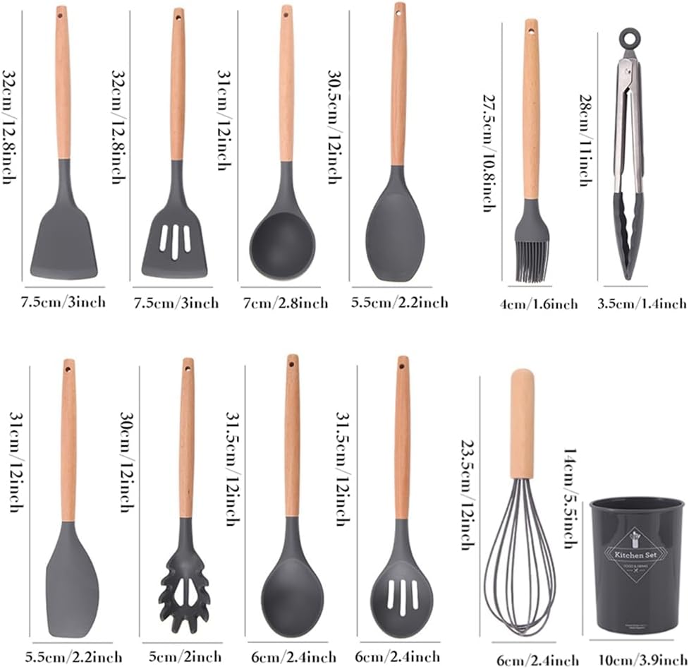 15-Piece Silicone Wooden Handle Kitchen Utensils Set, Cooking Tools with Holder, Kitchen Gadgets for Non-Stick Cookware