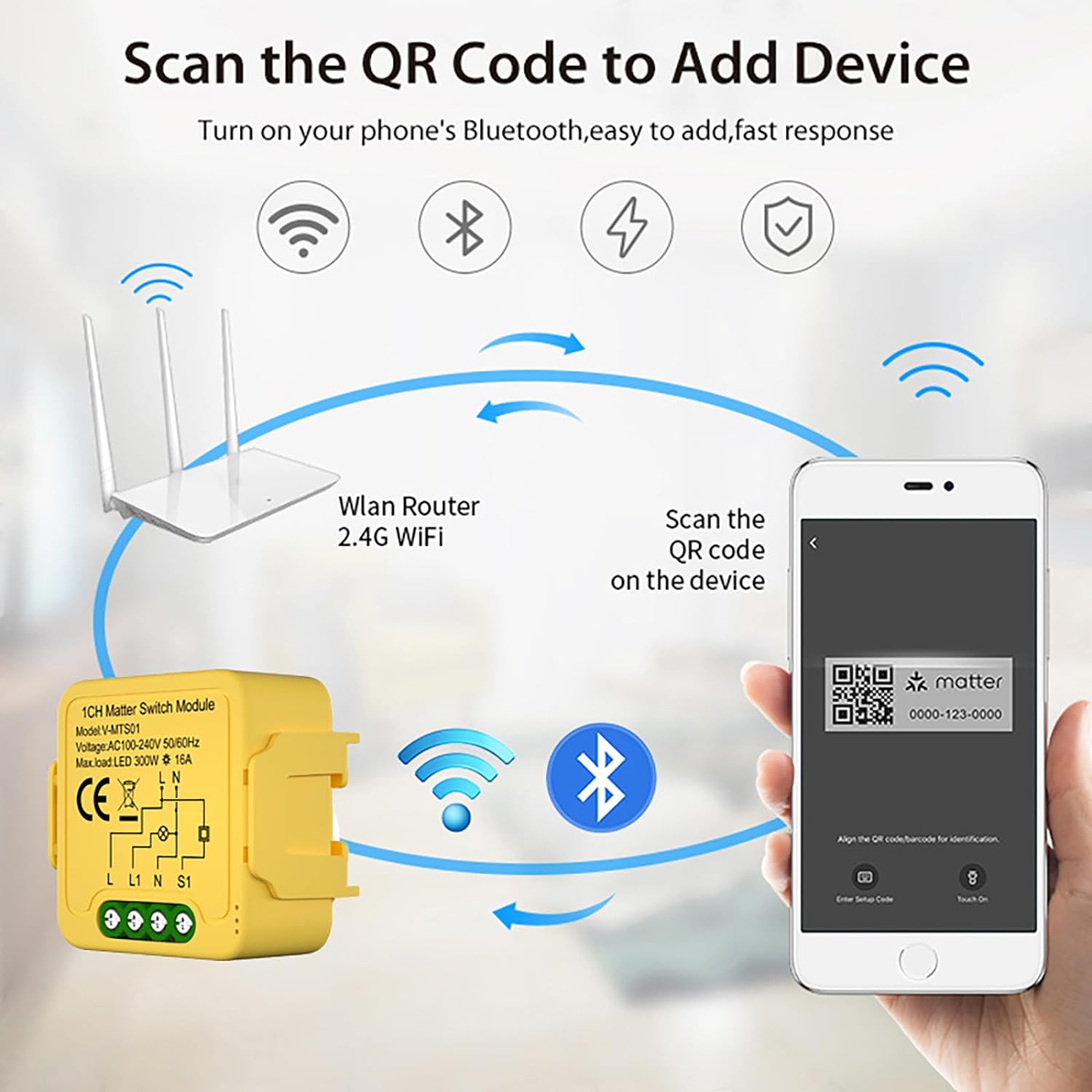 Just turn on Bluetooth and scan the QR code to complete the setup! A smartphone running iOS 16.1 version (or higher), or Android 8.1(or higher), matter light switch device only works with a 2.4GHz WiFi and IPv6 network, and Matter-certified hub or controller is required for the selected platform.