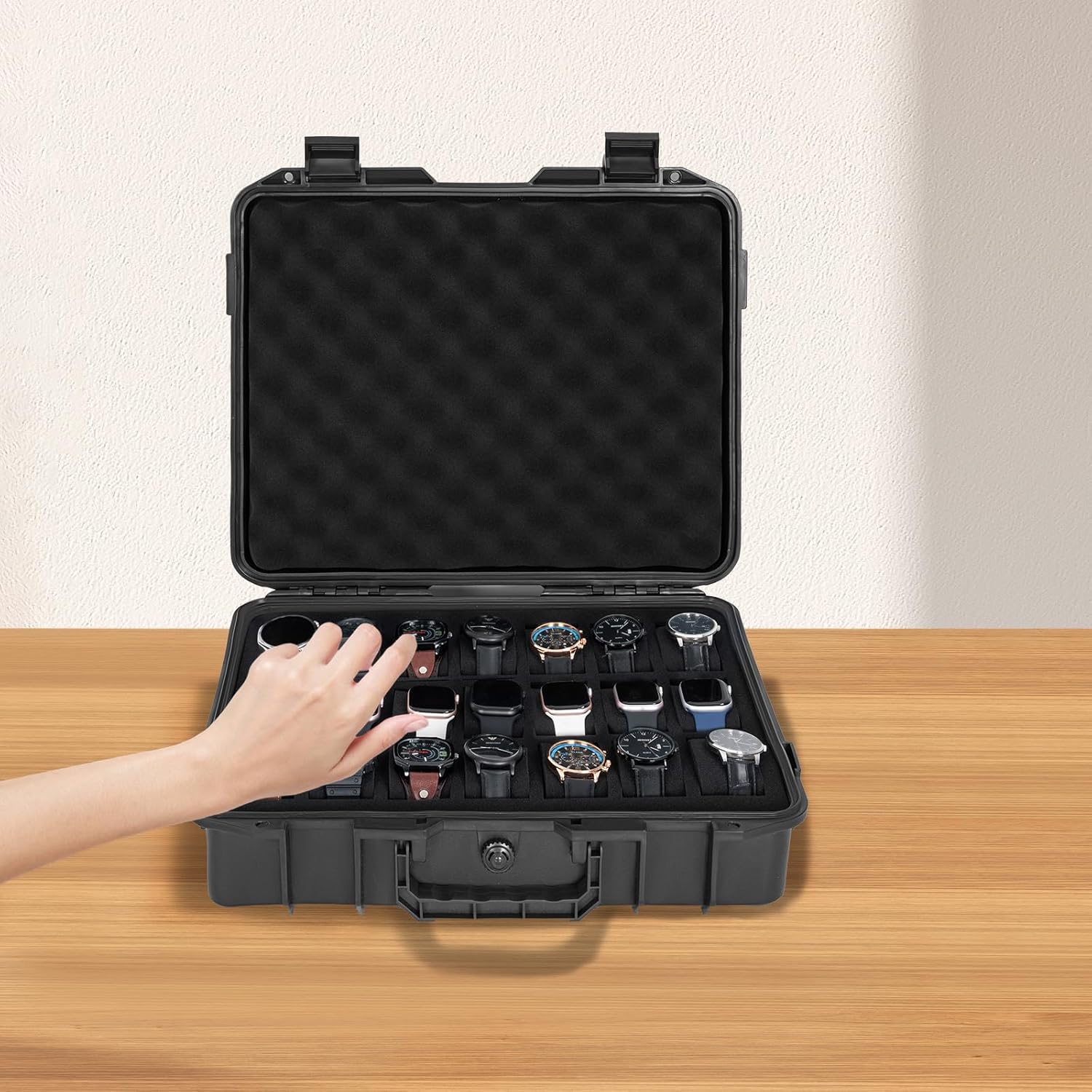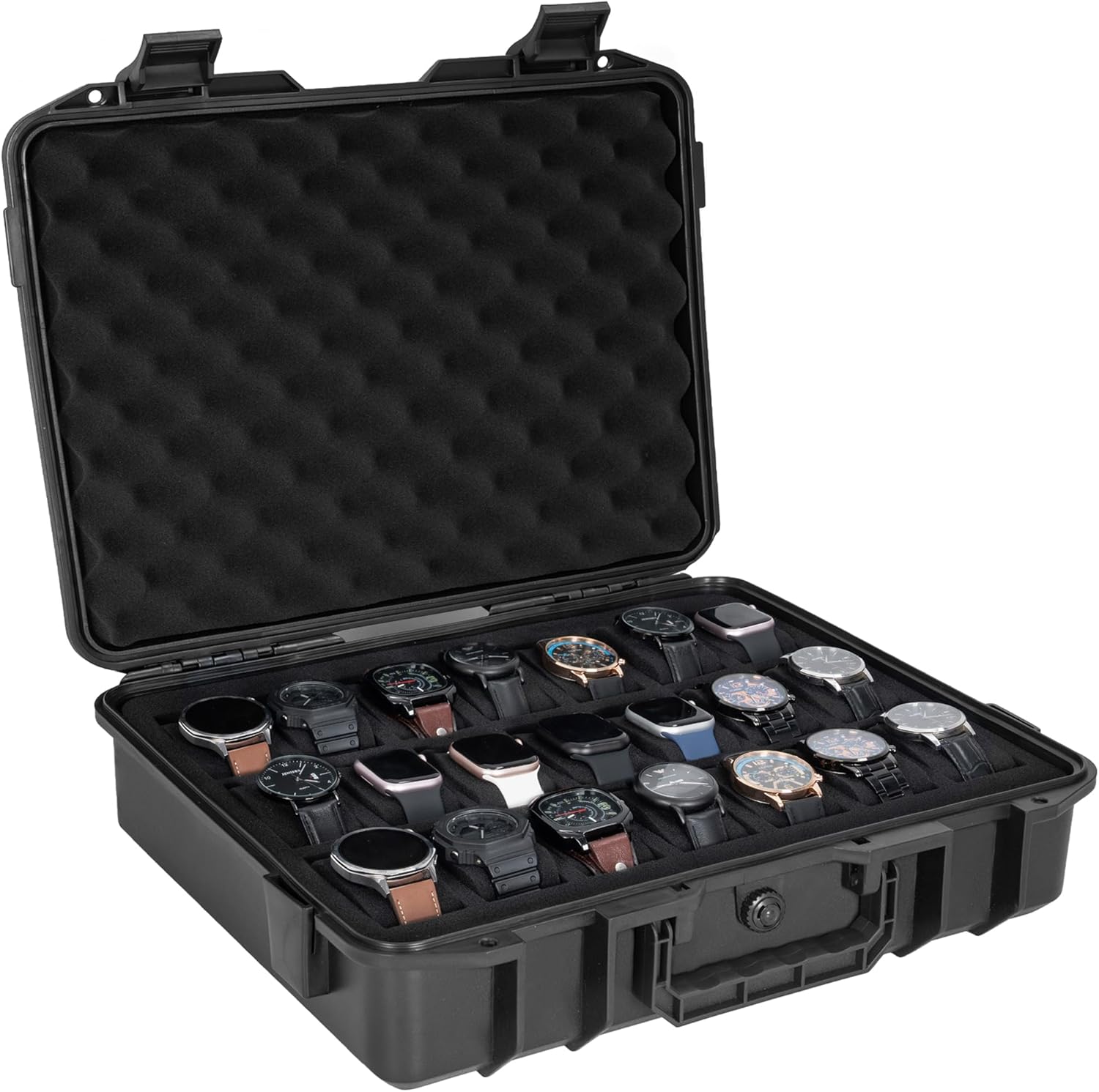 【Spacious 21 Slot Watch Organizer Case】: Measuring 16” x 14” x 4”, this watch hard case is designed to securely store up to 21 watches of all sizes. Each watch rests in its individual foam slot with removable velvet pads, keeping your collection neatly displayed and protected from scratches.