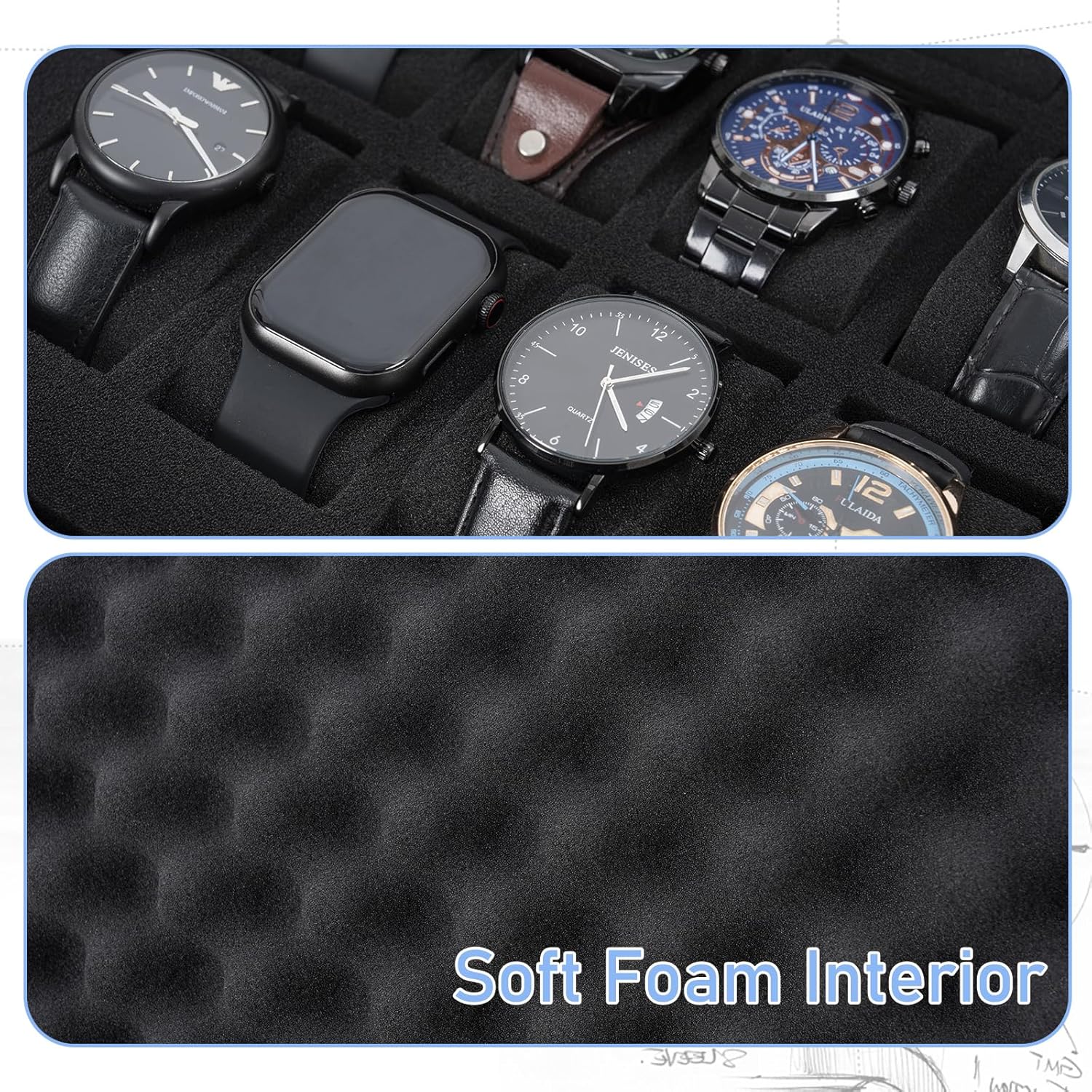 【Shock-Absorbing Foam Interior】: The interior of waterproof watch travel case features high-density foam that absorbs impact while holding your watches snugly in place. Our watch carrying case prevents movement and minimizes risk of scratches or damage.