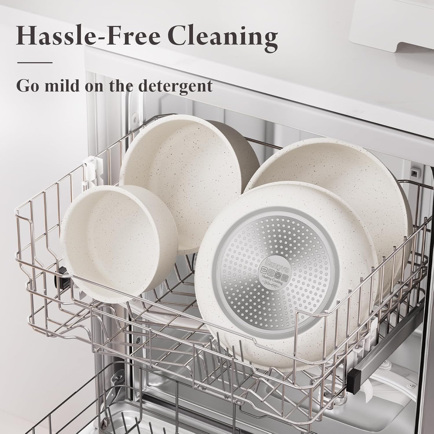 Easy to Clean: This ceramic cookware set is dishwasher-safe, but for optimal longevity, we suggest hand washing. Simply detach the handles when not in use and easily wipe or rinse your pots and pans to keep them looking brand new.