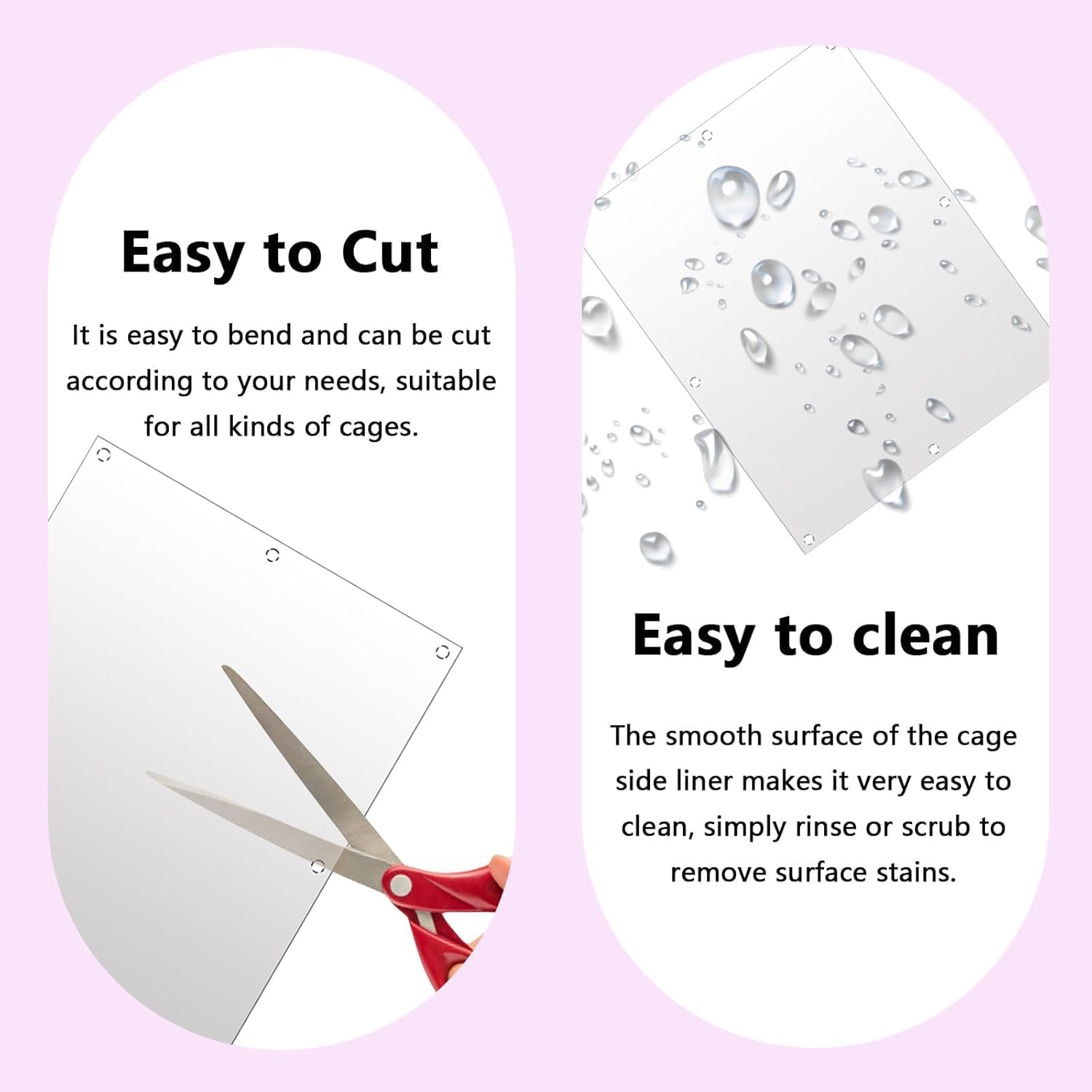 Easy to Install and Clean: Our cage edge liner has 8 holes per piece, giving you enough holes and ties to attach the liner to the cage with ease. The smooth surface only needs to be rinsed with water and then wiped with a rag to remove the stain and can be reused.