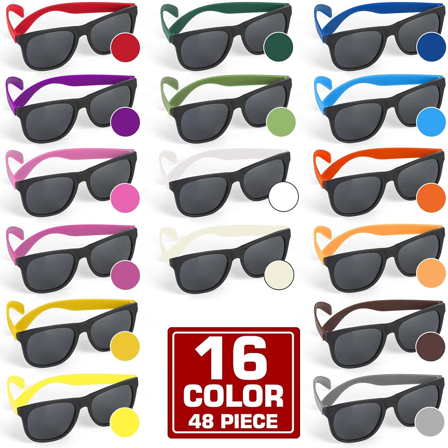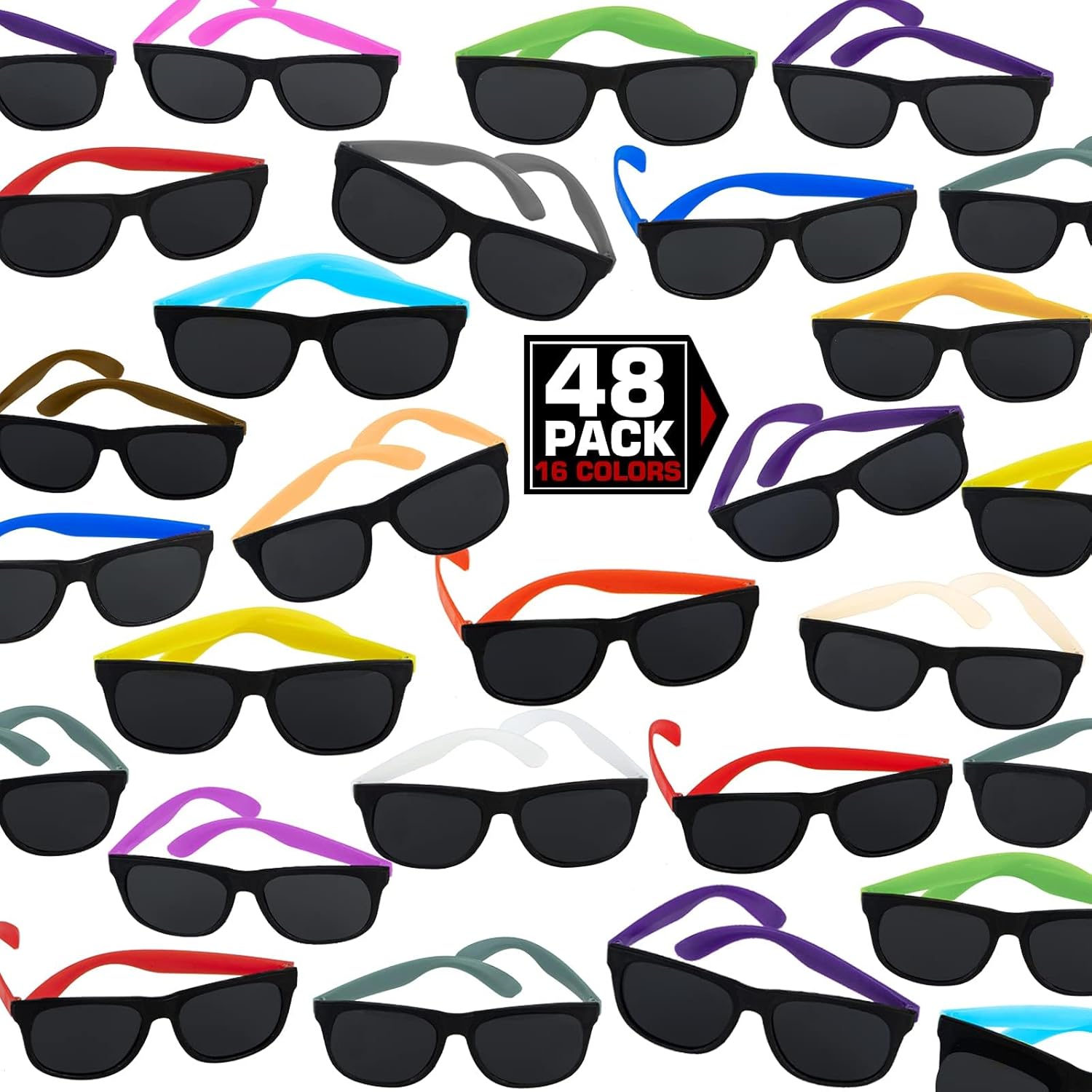 48pc Sunglasses sets include 16 neon colors, the neon color on the hinge reminisces of the 1980’s fashion trend. Wear colorful sunglasses, you will be the center of everyone’s attention at the party!