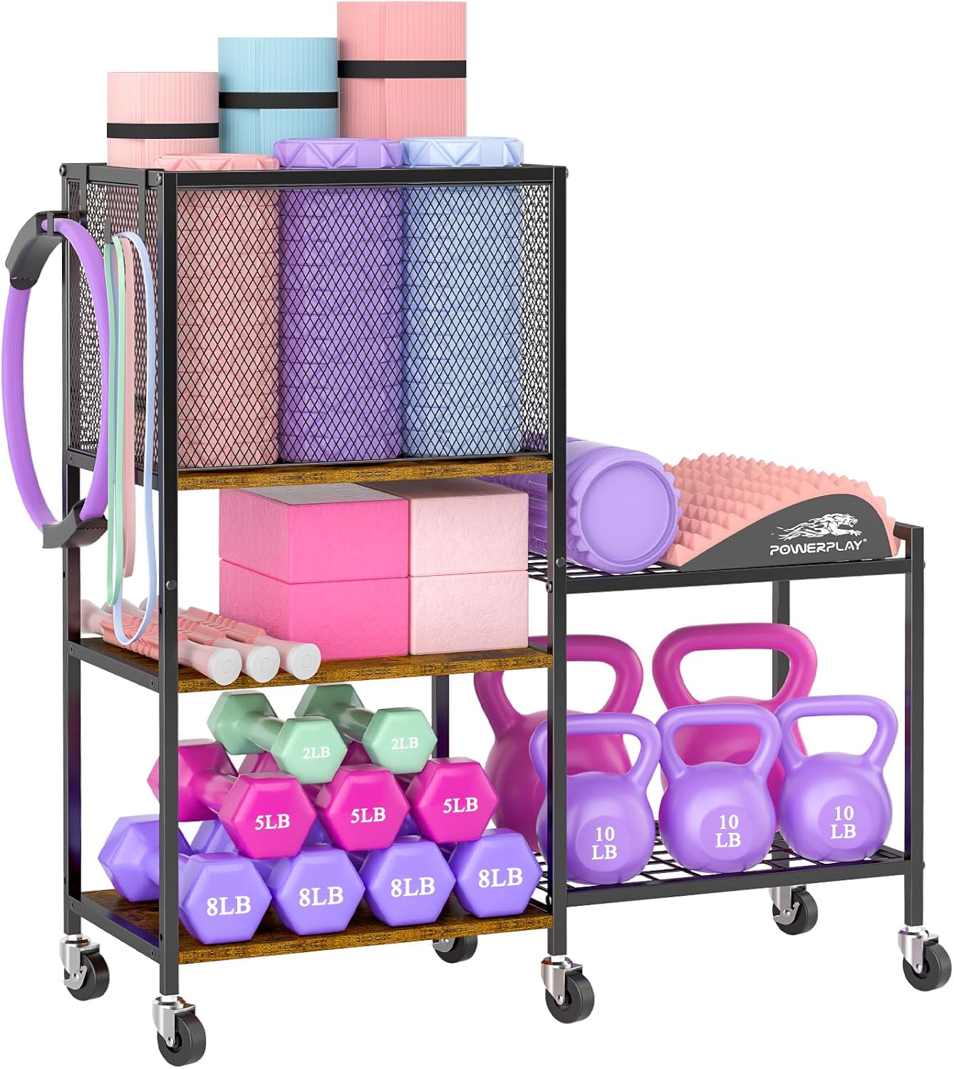 【Sturdy and Durable】The combination of high quality wood and metal increases the sturdiness and durability of this fitness equipment storage rack so that you can store approximately 65 pounds of weight on each shelf. Also, 6 metal wheels add great stability to this yoga rack while on the move.