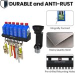 Simple yet Multi-purpose: Oil bottle rack stores 6 bottles of oil or other fluids, includes provision for funnel storage that drains into empty oil bottle, Features 5/8-inch wide slots along bottom relief to hang straps or other items, Keeps tools at your fingertips.