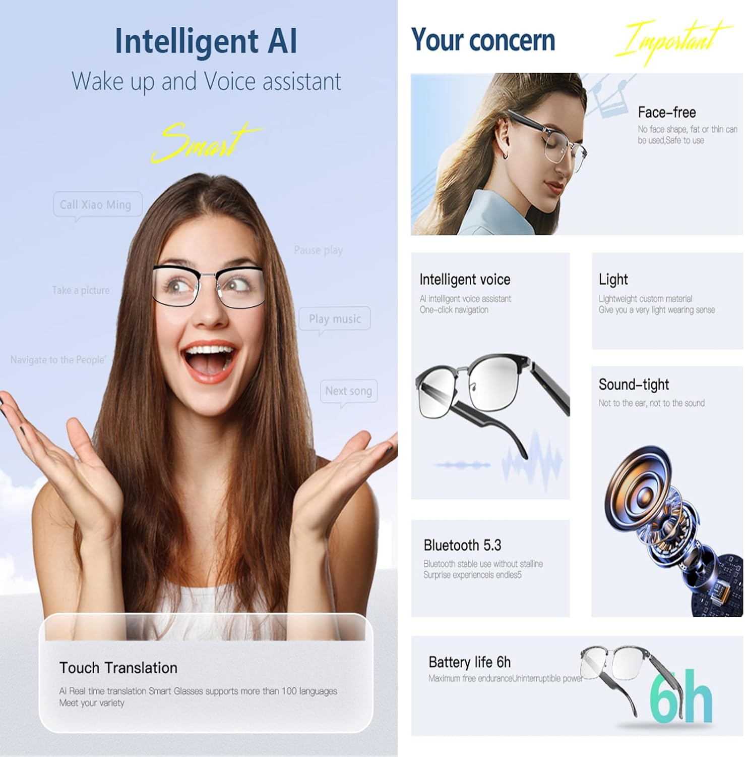 AI Translation Glasses with Over 144 Languages Real-Time Translation, Touch Control, Voice Assistant, Anti-Blue Light, Smart Music Glasses, Great for Business, Travel, or Overseas Students(Black)