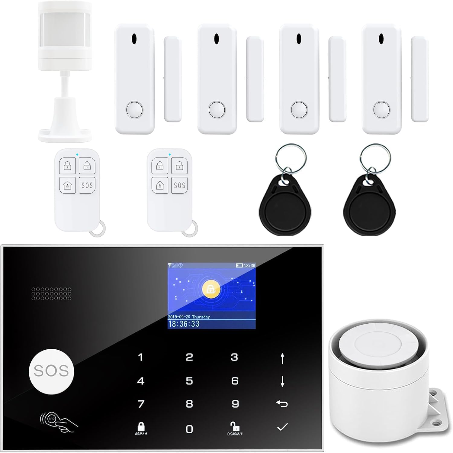 【Wirless Security System】– A smart way to protect your house with our smart home alarm system wireless. The smart wifi house alarm system 11-piece kit includes: 1 wifi alarm base station, 4 windows & door sensors, 1 wired siren, 1 motion sensors, 2 remote controls and 2 RFID card. Arm and disarm your alarm system with keypad and remote in seconds or directly from your phone via the Tuya/Smart Life App. No contracts and No subscription fee.