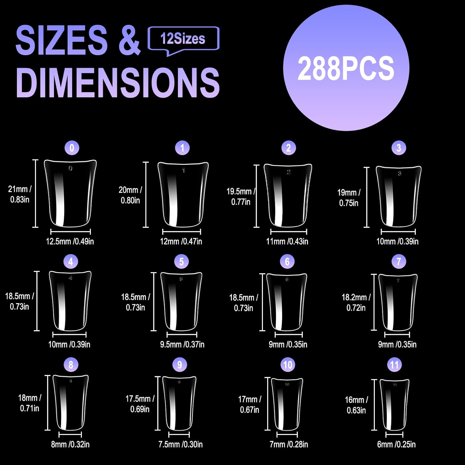 Short Duck Nail Tips With Full Cover – The nail kit of duck nails has 12 sizes with 288 pcs, with the longest measuring 0.83 inch/22mm and the shortest measuring 0.63 inch/16mm. Duck tip nail offers flexibility and customization, allowing users to choose the right fit for different nail lengths. Full-cover duck nails tips is ideal for short nails or those looking for instant length. Full cover nail tips offer a smooth, uniform surface for design.