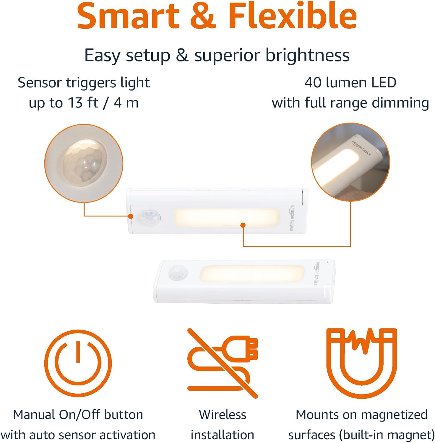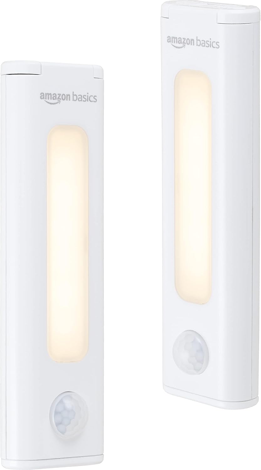 Amazon Basics LED Stick On Lights, Battery Operated, Motion Sensing, Wireless, 40 Lumens, Portable Light, Under Cabinet Lighting, Closet, Kitchen, Pack of 2, White
