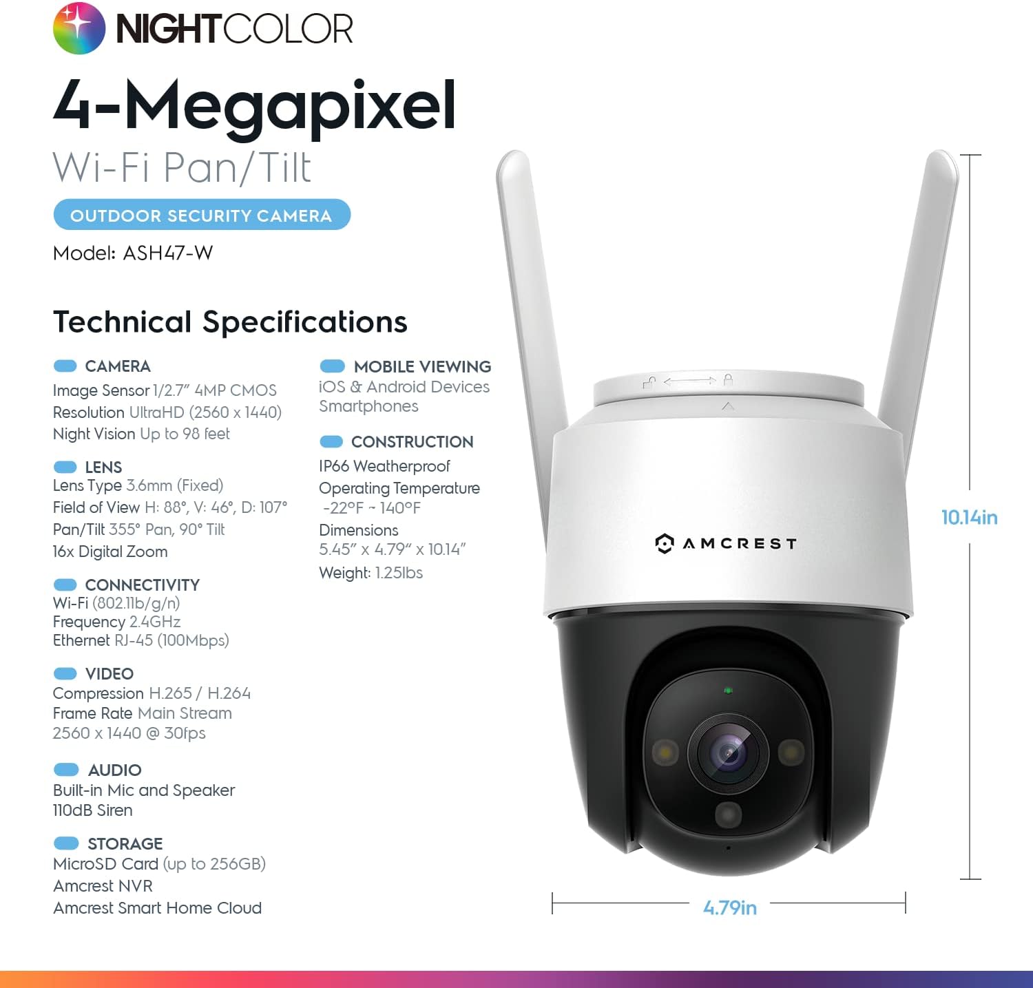 Amcrest 4MP Outdoor PT WiFi IP Camera Pan Zoom (Digital 16x) SmartHome WiFi Camera Security Speed Dome, Motorized Tilt, 98ft Nightcolor, (2.4Ghz), 107º FOV, IP66, 4MP, ASH47-W