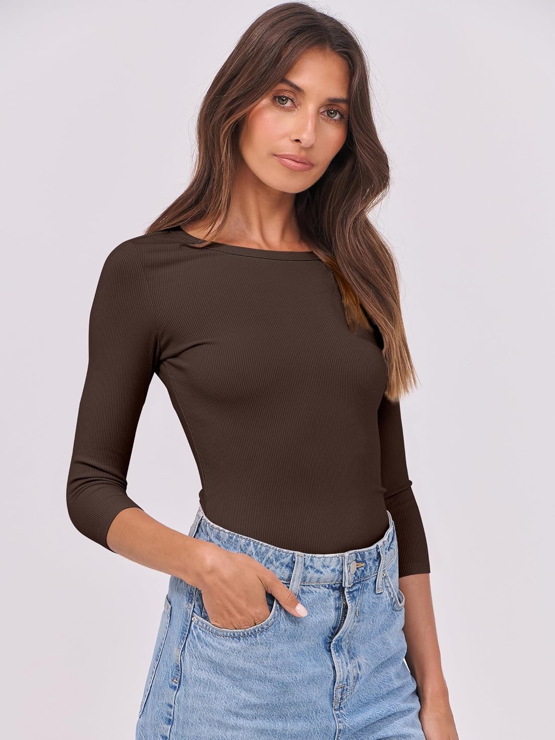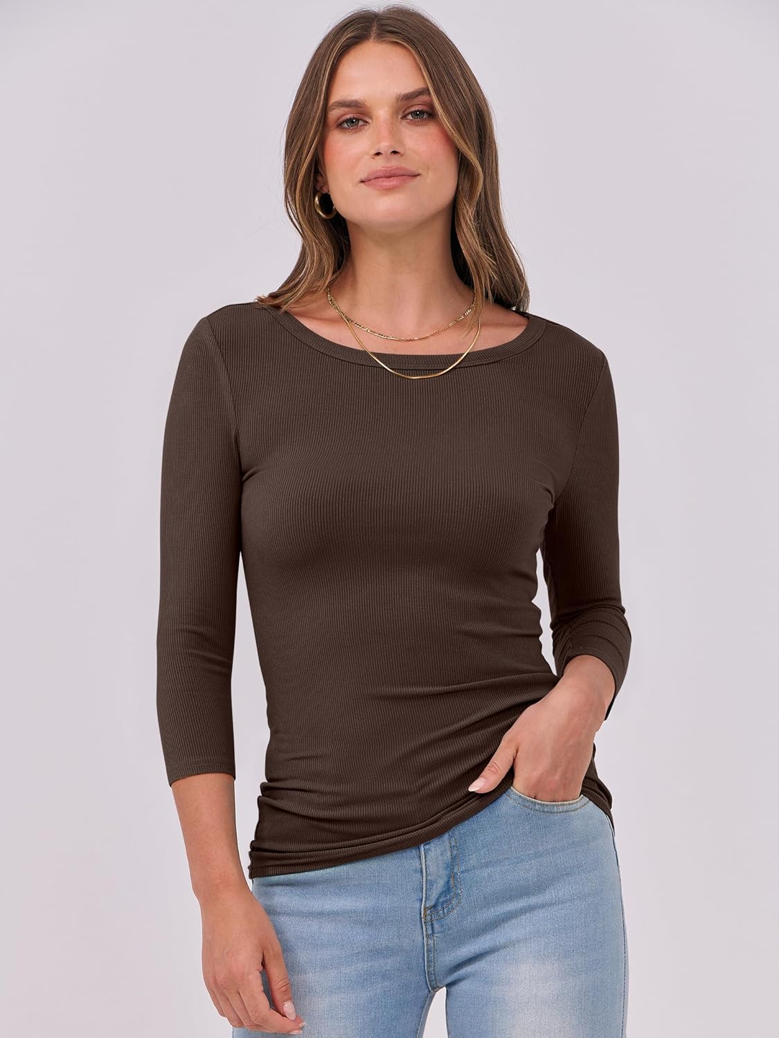 ANRABESS Women 3/4 Sleeve Crewneck Rib Knit Slim Fit Shirts Basic Tee Tops 2025 Summer Casual T-Shirt Workout Outfits Clothes