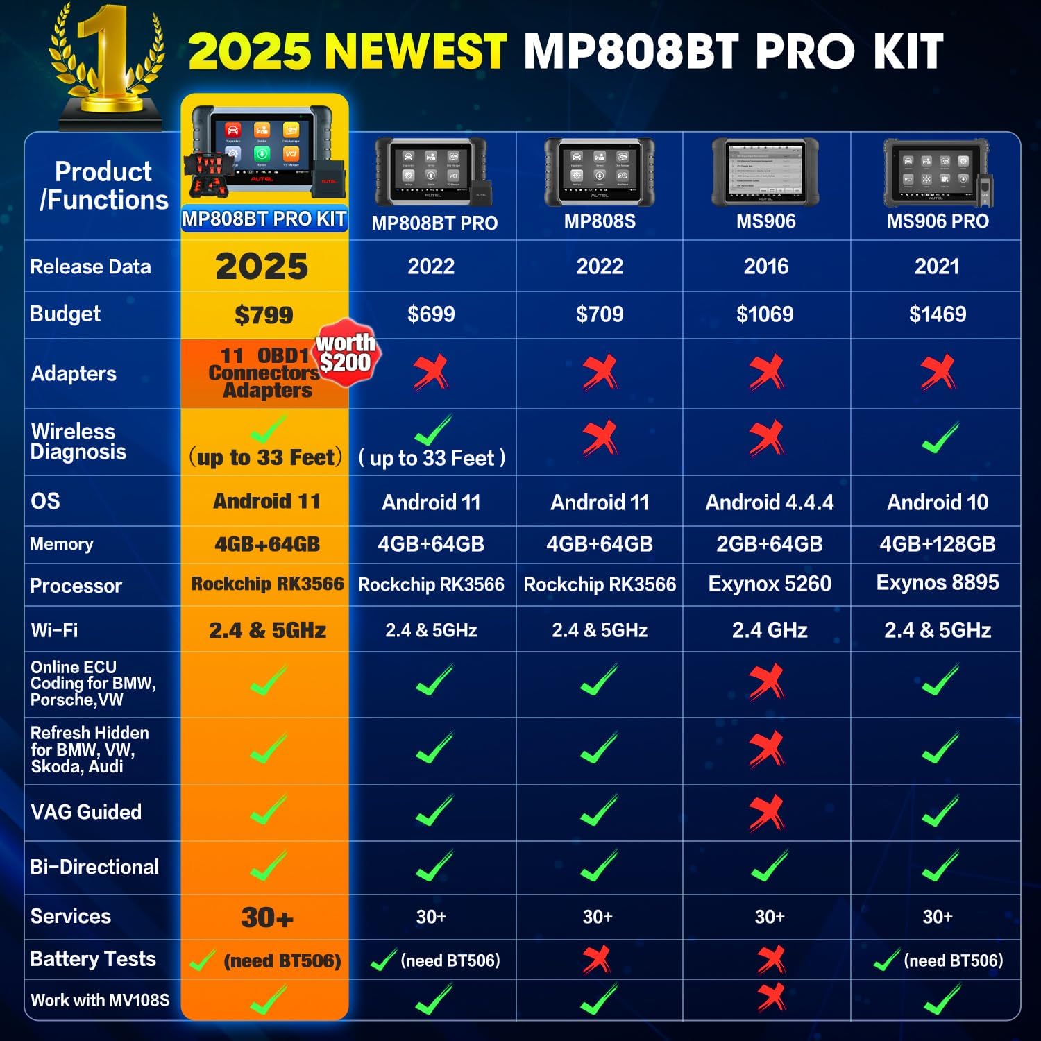 🆕【KING OF COST-EFFECTIVE & 2-YEAR FREE UPDATES】2025 MP808BT PRO KIT (2 Years No-fee Update, worth 700 b-ucks) has almost all functions of MS906 PRO/ MP900BT/ MK900BT/ MK900/ MX900/ MK808S, it was upgraded from MP808S/ MS906, more cost-effective and powerful. Besides, advanced ECU Coding, 200$ non-OBD II adapter kit, 30+ Services, 3000+ Bidirectional, VAG Guide for Audi/VW/Skoda/Jetta, OE full systems, Battery Test (w/ BT506), Smart AutoVIN, FCA & Renault SGW,150+ Brands(1996-2025), etc. make MP808BT PRO KIT essential.