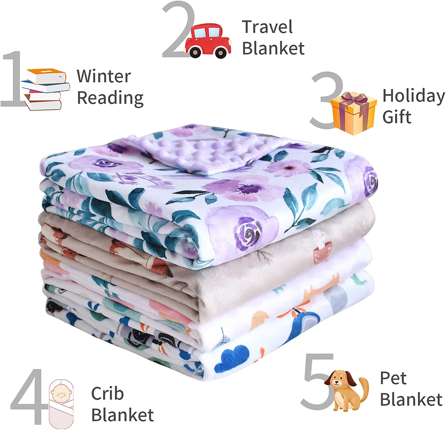 DOUBLE LAYER DESIGN:The double layer design allows it to be used on both sides,each side is a different texture,both sides are very soft and comfortable,you must have this baby blanket for your baby or toddler.Our minky baby blankets make a fantastic gift for any new parent, as they are both practical and stylish
