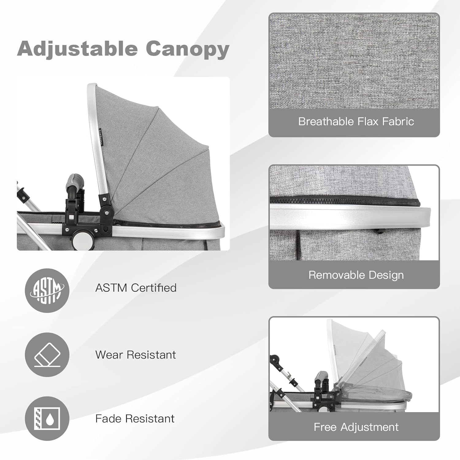 Adjustable Back Rest & Canopy – You can adjust the back of this stroller to meet your baby different requirements to lie, sit, or sleep. The comfortable seat with 5-point safety harness and tilt-adjustable sleeping cushion equipped for babies comfortable sleeping. The Canopy with covered sunroof ratchets can well protect your baby from ultraviolet radiation. With 3-section canopy design, adjust it freely. You can also look at your babies with peek a boo windows to better take care of them.