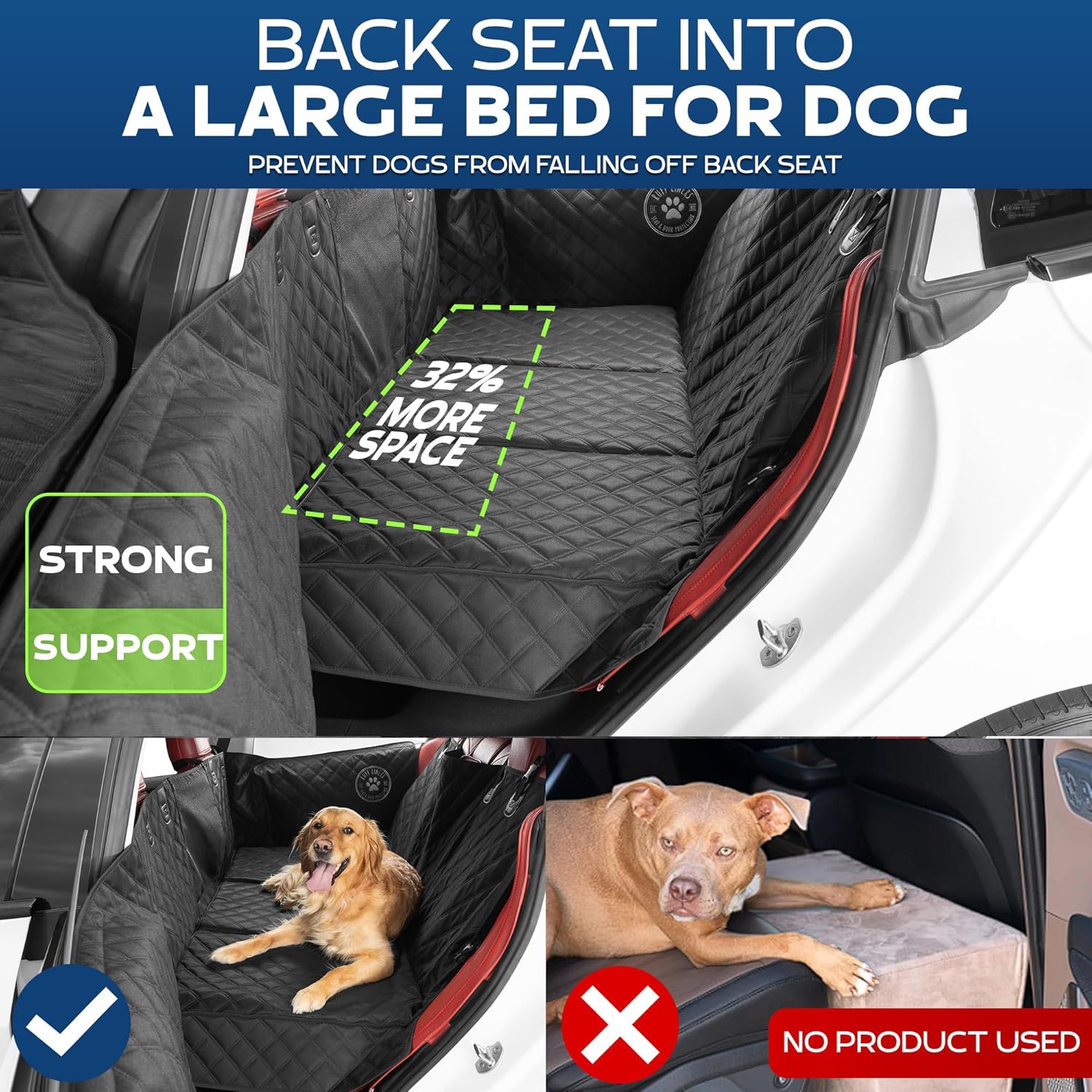 SPACIOUS & STABLE FOR ALL BREEDS – This dog car seat cover for back seat features a hard bottom that expands space by 32%, supports up to 400 lbs, and includes firm inserts to prevent slipping into footwells—ideal for multiple large dogs or older, anxious pups.