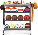 Basketball Rack, 4-Layer Ball Rack Rolling Balls Organizer with Baseball Bat Holder & Hooks Sport Equipment Storage Cart with Wheels for Football, Volleyball, Soccer