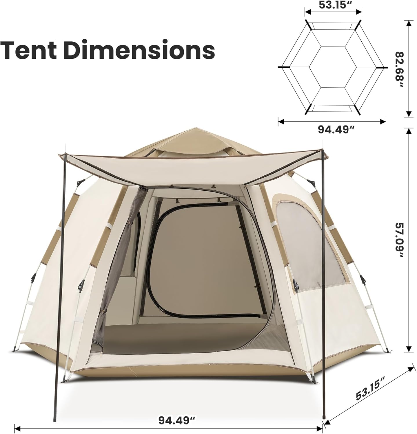 Roomy Hexagon Tent: Experience comfort with our spacious hexagon tent, designed to fit 2-6 people with ease. The unique six-sided structure maximizes interior space, allowing plenty of room to move and relax. Plus, the included extendable canopy of the beach tent expands your shaded area, adding extra versatility for lounging or outdoor activities. Whether you’re camping with family or gathering with friends, this backpacking tent ensures ample space and comfort for every adventure