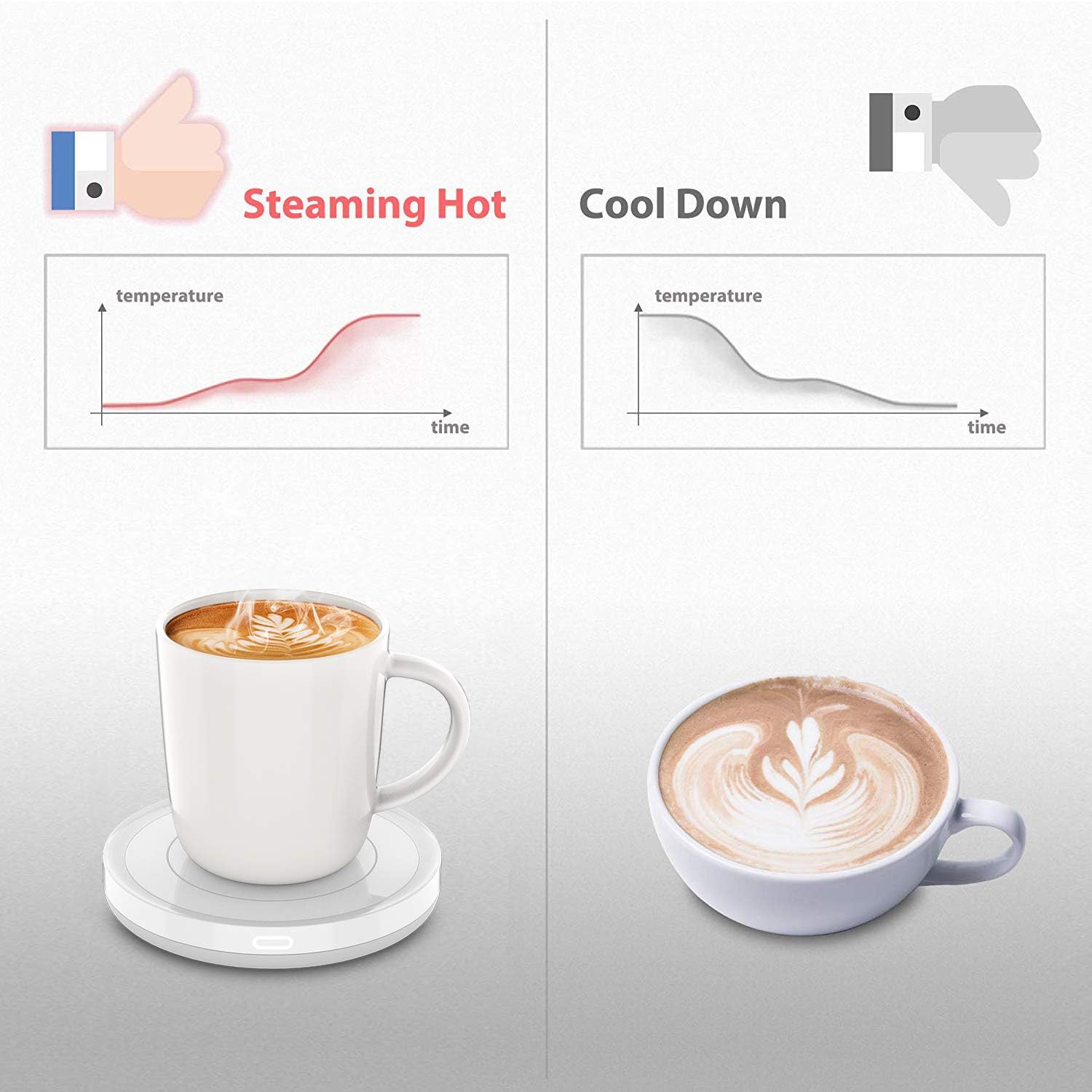 19-Watt mug warmer for use with any hot beverages like coffee, tea, milk, etc.Built-in gravity induction switch, just place your mug on it, it will automatically turn on, no need to turn it on/off manually.Always keep your hot coffee or tea at a drinkable temperature (131F/55C).Adopt waterproof design, easy to clean, safe and reliable.