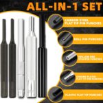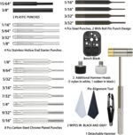 2.All-IN-1 Set: Includes everything you need to get started and suitable for everyone, whether you’re a novice or a veteran. This punch set includes 1/8″, 9/64″, 5/32″, 3/16″, 7/32″, 1/4″, 9/32″ and 5/16″. 2Pcs 3/8″,15/64″ plastic pin punches; 1 metal tweezers and 1 hammer with 4 detachable hammer heads; 4Pcs hollow end starter punch set including 1/16”,5/64”,3/32”,1/8”; 2 Pcs flat pin punches including 1/16″ and 3/32″; 2 Pcs roll pin punches including 1/16″ and 3/32″; 8Pcs carbon steel punches.