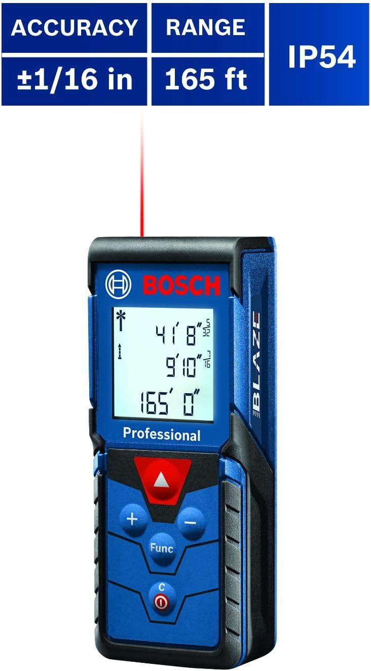 BOSCH GLM165-40 Blaze 165 Ft Laser Distance Measure, Includes 2 AAA Batteries, Hand Strap, Target Cards, & Pouch