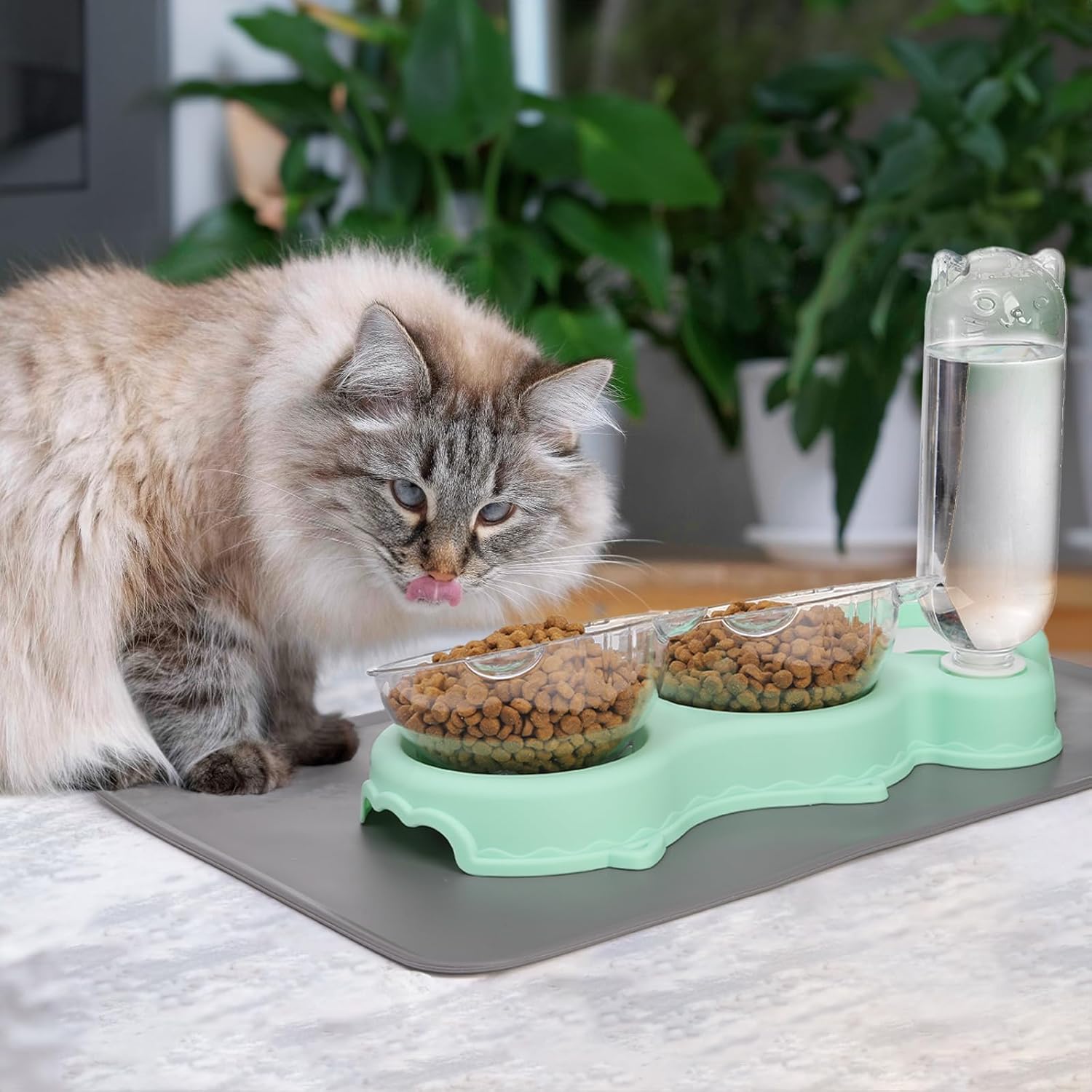 Cat Food Water Bowl, Triple Cats Bowls with Mat and Scoop, 15° Tilted Raised Cat Bowl Dishes with Automatic Water Bottle, Pet Feeding Bowls for Cats, Small Dogs, Wet, Dry Food