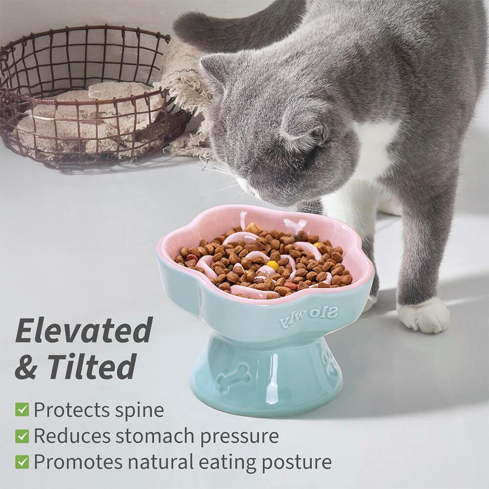 Ceramic Raised Slow Feeder Cat Bowl Elevated, Shallow Wide Tilted, Anti-Vomiting, Durable Cute Flower Pet Feeder Bowl for Dry Wet Food, Nonslip for Indoor Cats, Pink