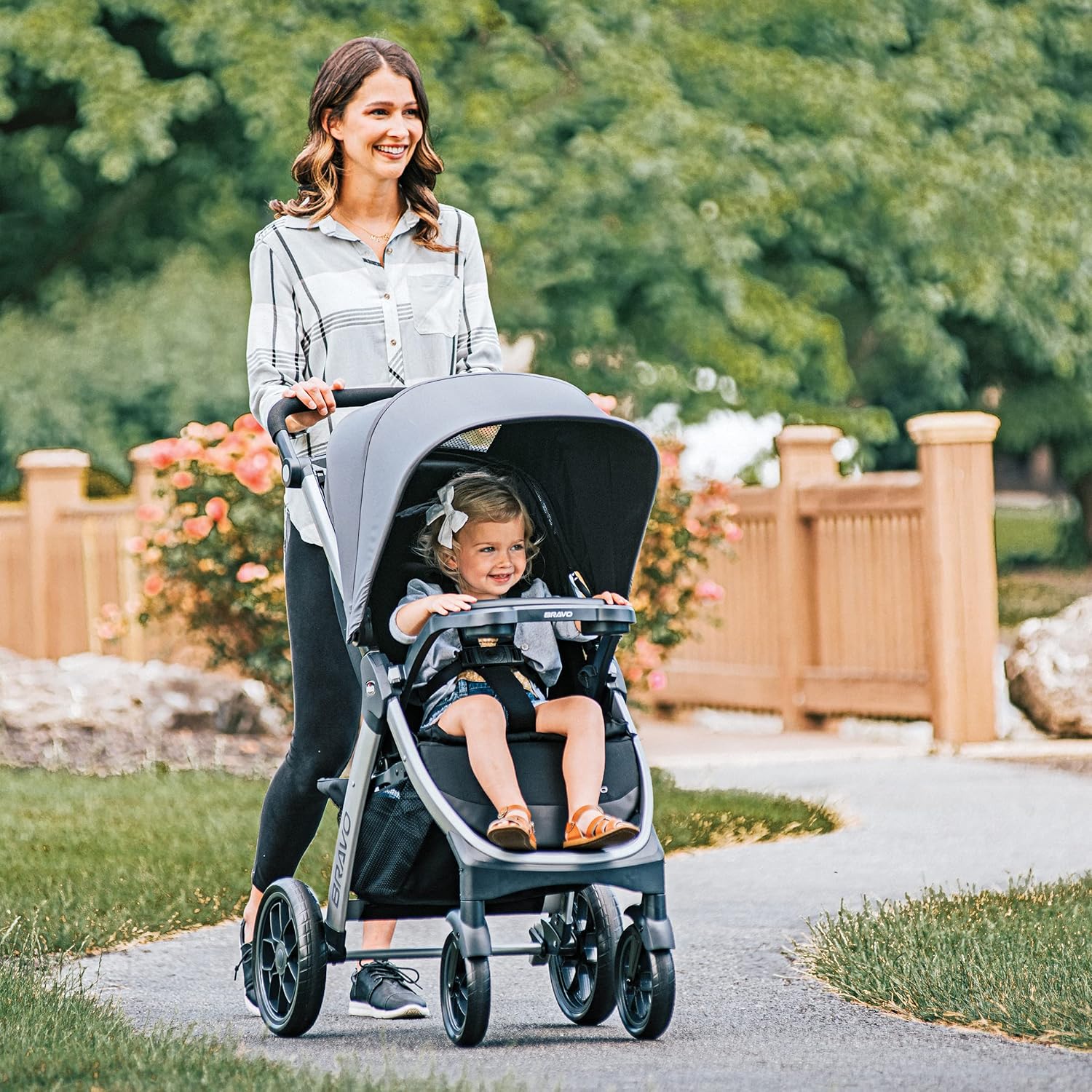 Removable seat and canopy transform Bravo to a lightweight car seat carrier for streamlined travel from day one