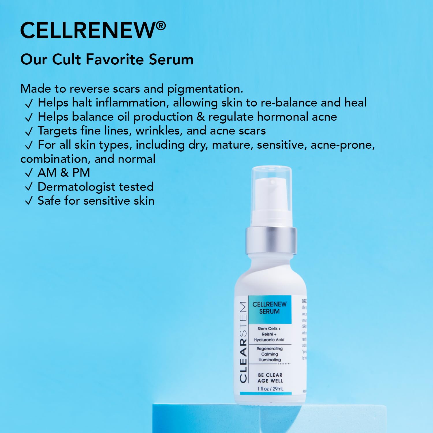CLEARSTEM – CELLRENEW – Collagen Stem Cell Serum – Acne + Youthful Skin Face Serum – Hyaluronic Acid, Reishi, Aloe Vera – Facial Skin Care Products – Vegan, Gluten Free, Cruelty Free – 1 fl oz / 29ml