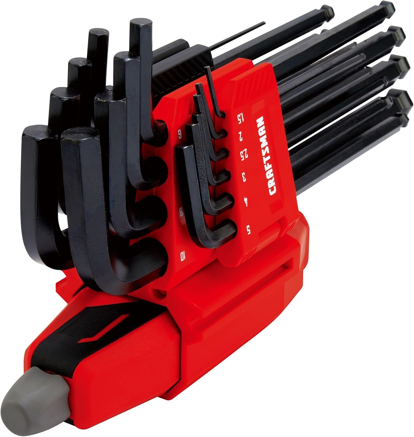 Use CRAFTSMAN’s patented Universal L-to-T adapter to quickly and easily convert most sizes of Metric , SAE and Torx l-keys to a T-handle when additional grip and torque is required. Simply slide any size key into the handle and turn the dial until L-key is tightly secured. Set includes 10 metric and 10 SAE hex keys each in separate flex holders that can be removed and repositioned as needed.