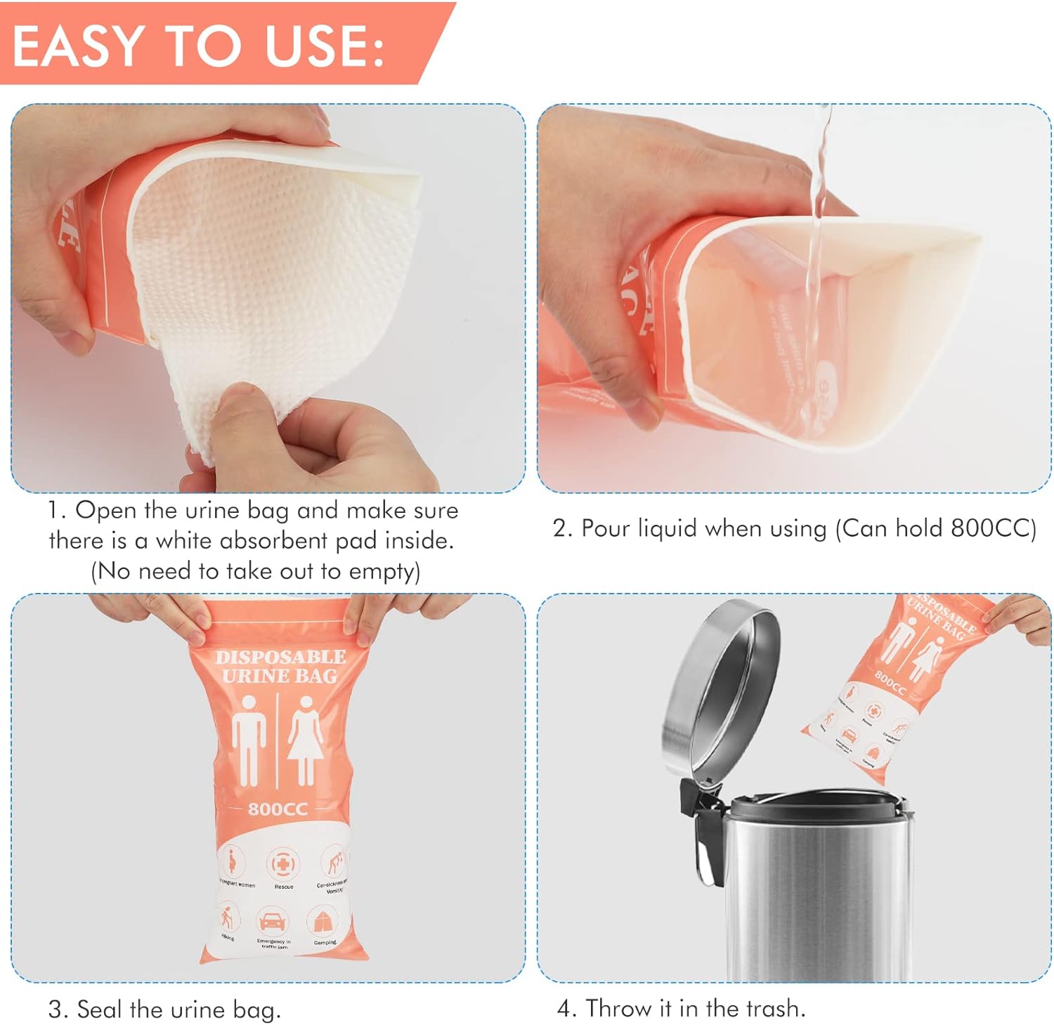 【Easy to Use】The emergency portable urine bag is very easy to use. Just open it and make sure there is a white absorbent pad in the pee bag before use, (no need to open or empty during use), it can hold max 800ml capacity and turn it into a gel in a short time. After use, pls seal it and throw it in the trash can.