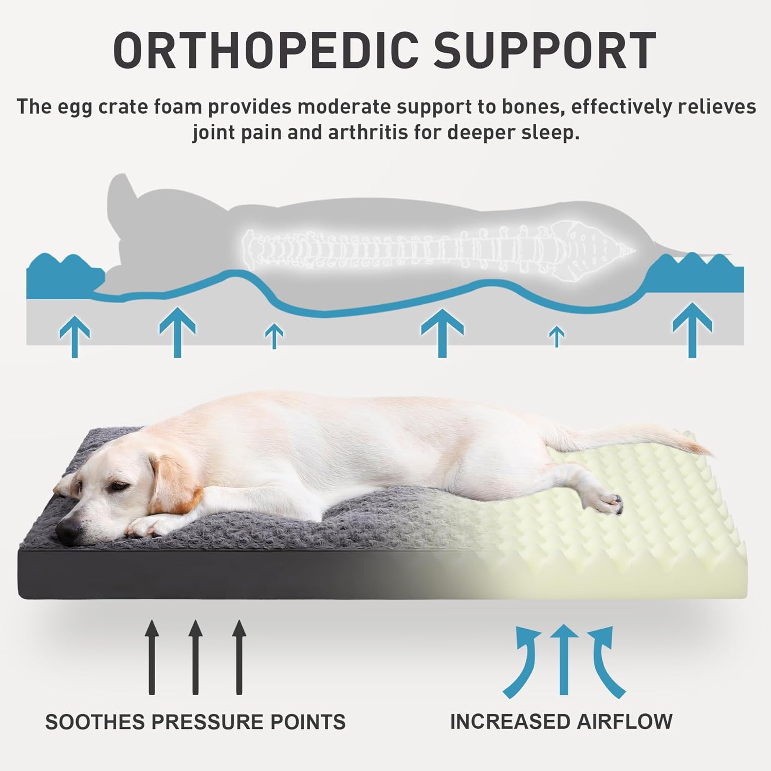 Orthopedic Support – Our dog crate bed equips a 3-inch thick high-density egg crate foam. The excellent elasticity supporting and long-lasting recovery ability comfort our dogs with strong support to bones and joint, effectively relieve joint pain and arthritis. This dog bed is especially suitable for puppies and older dogs.