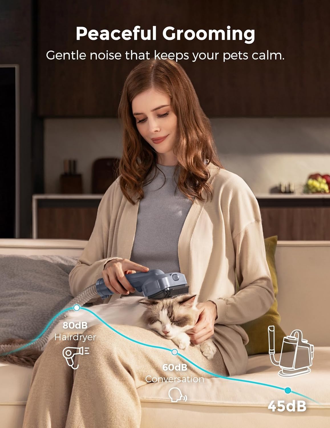 𝐒𝐓𝐑𝐄𝐒𝐒-𝐅𝐑𝐄𝐄 𝐆𝐑𝐎𝐎𝐌𝐈𝐍𝐆: With noise levels as low as 45dB on the lowest suction setting, the FurEase dog vacuum for shedding grooming ensures a calm grooming experience for your pets. For first-timers, try our desensitization steps to keep them calm and relaxed during trimming.