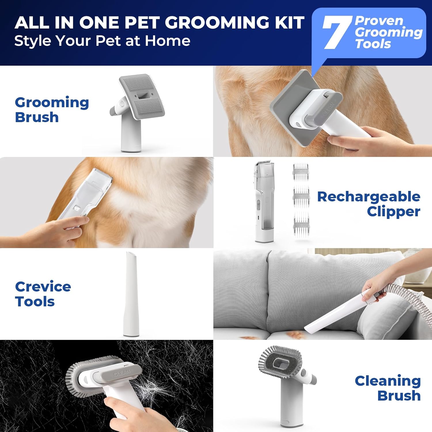 All-in-one Dog Grooming Vacuum: The pet grooming vacuum comes with 5 proven tools: Grooming brush and deshedding tool gently removes loose hair and eliminates tangles while promoting soft, smooth and healthy pet skin and coat; Rechargeable electric clipper provides excellent cutting performance, give your pet a best grooming experience. Nozzle head and Cleaning brush can be used for collecting pet hair falling on the carpet, sofa and floor