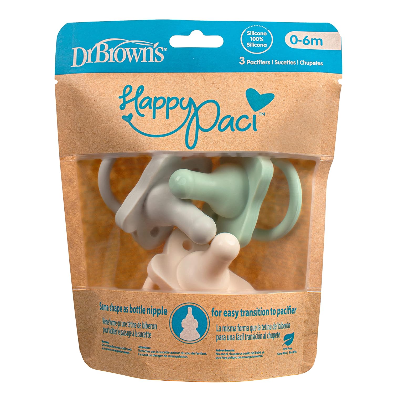 Dr. Brown’s HappyPaci 100% Silicone Baby Pacifier, Contoured One-Piece Design, Cool Gray, Green, Ecru, 0-6m, BPA-Free, 3 Pack