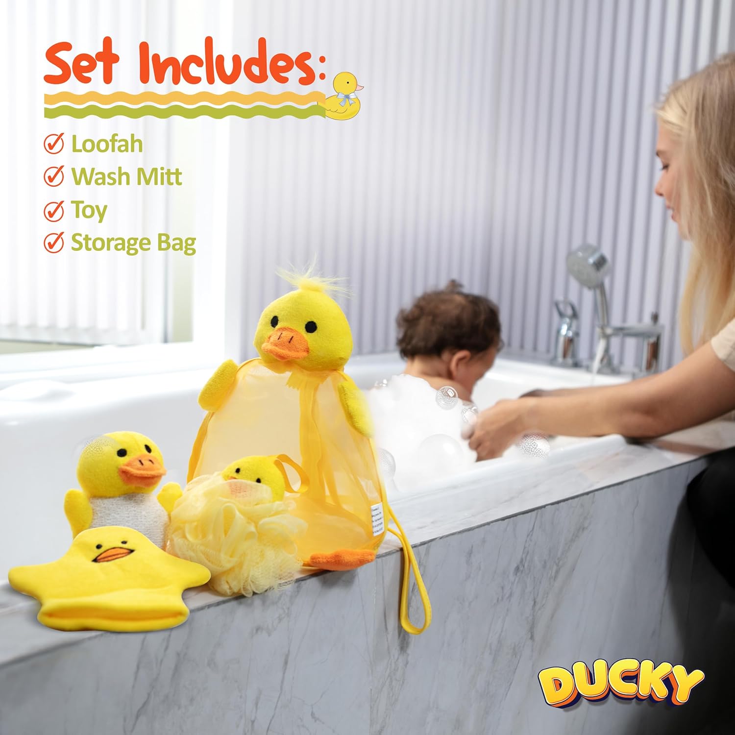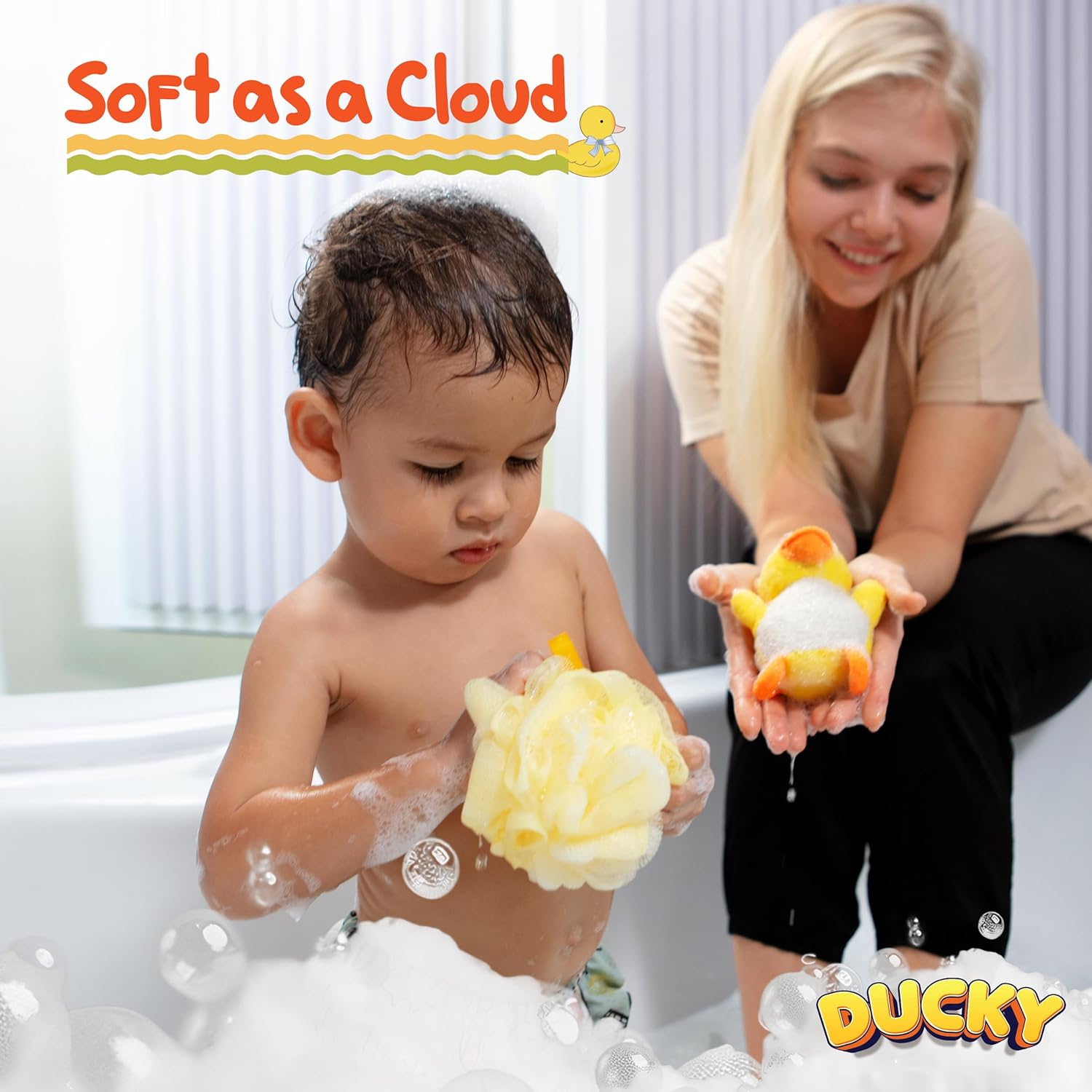 Ducky Scrub ‘N Soak Baby Loofah for Bathing Set for Kids Body Scrubber Cute Cartoon Kids Loofah Bath Scrubber for Children Shower Washing Exfoliating, Baby Bath Sponge Yellow Duck Included