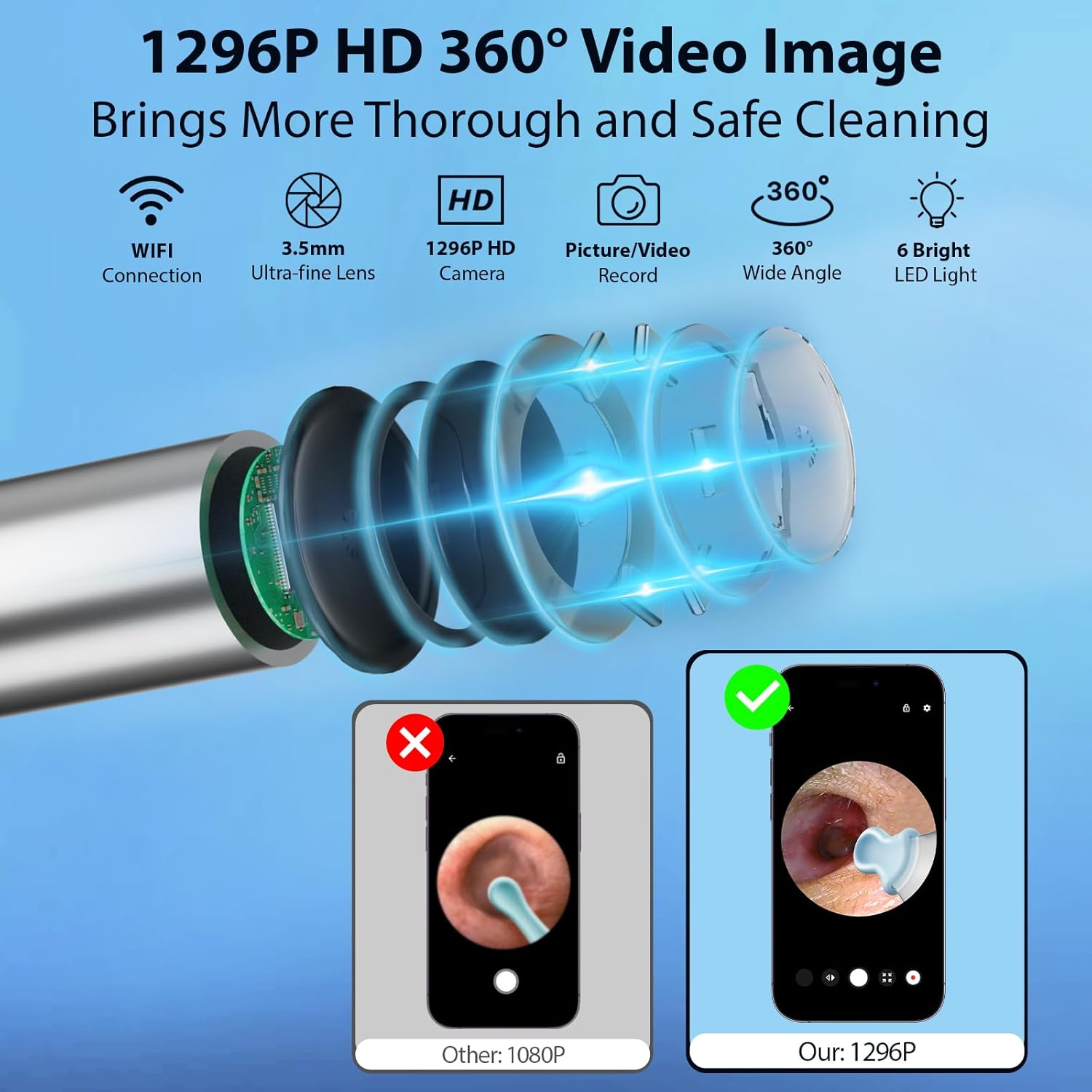 1296P HD Ear Camera: This ear wax removal features a 3.5mm high-precision lens offering a 360° wide-angle view, equipped with six adjustable LED lights to ensure clear visibility in any setting; During use, the ear cleaner gently heats up to maintain a temperature similar to that of the human body, enhancing comfort