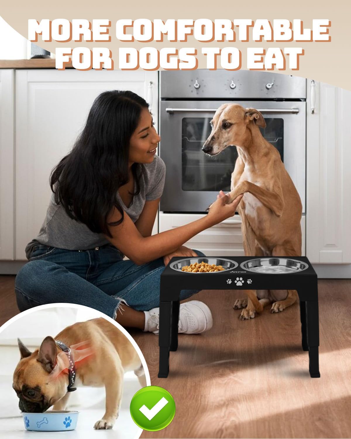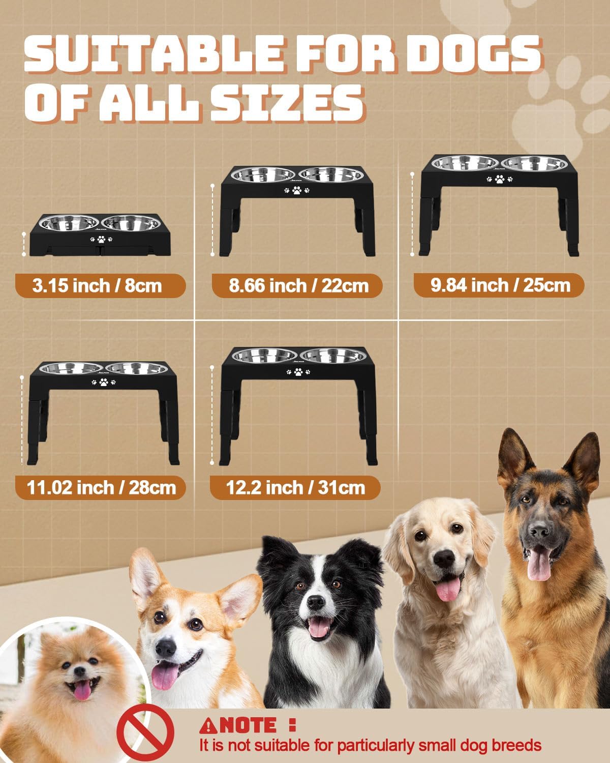 5 Heights Adjustable Stand: The dog bowl stand can be adjusted to 12 inches, 10&11inches, 9 inches, and 3.1 inches. The raised dog bowl can not only makes it easier and comfortable for dogs to access their food and water, but also prevents dust or floor debris from falling into the bowls, ensuring a clean and healthy dining experience.
