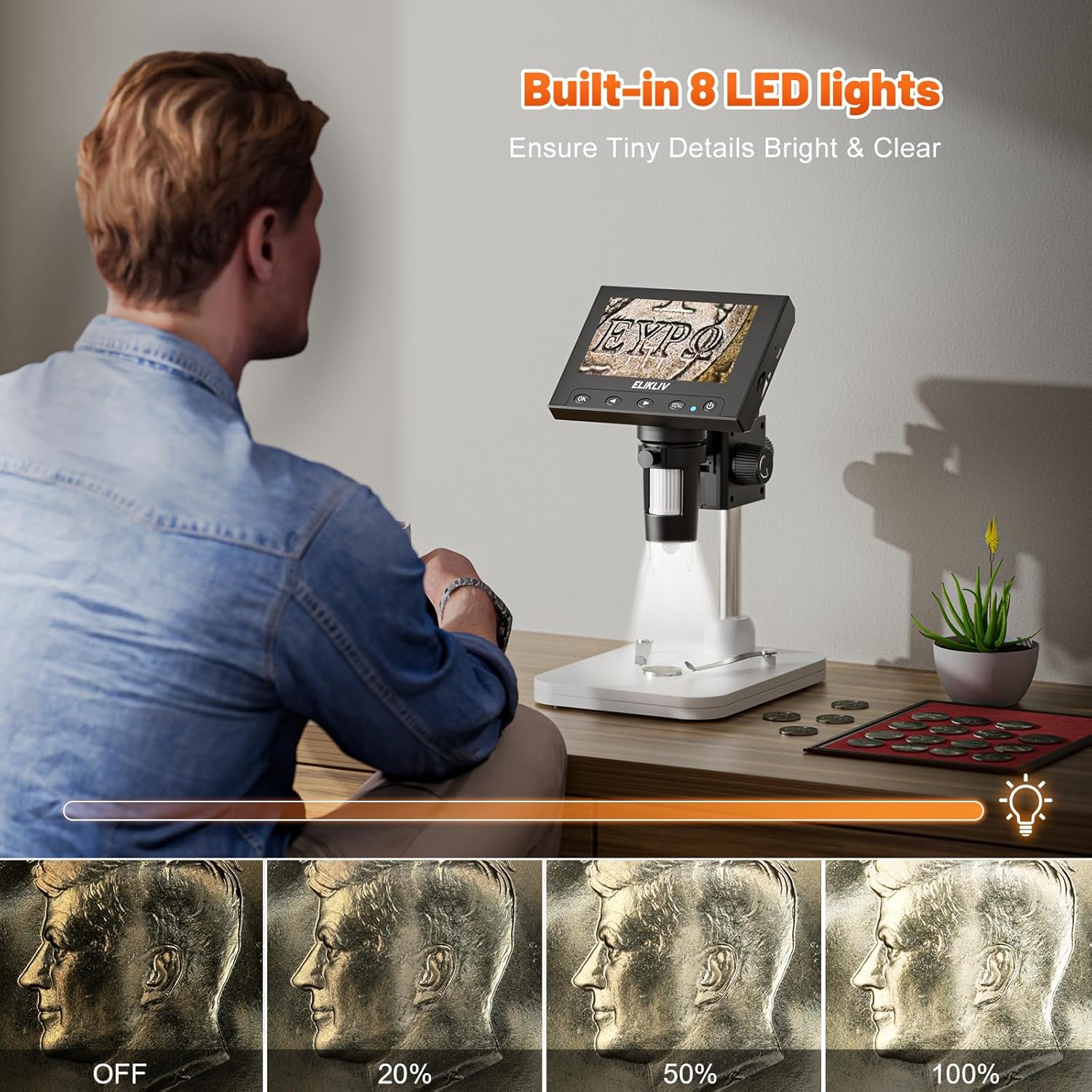 Elikliv Microscope, LCD Digital Coin Microscope 1000x, Coin Magnifier with 8 Adjustable LED Lights, PC View Compatible with Windows/MacBook, EDM4, 4.3 Inch