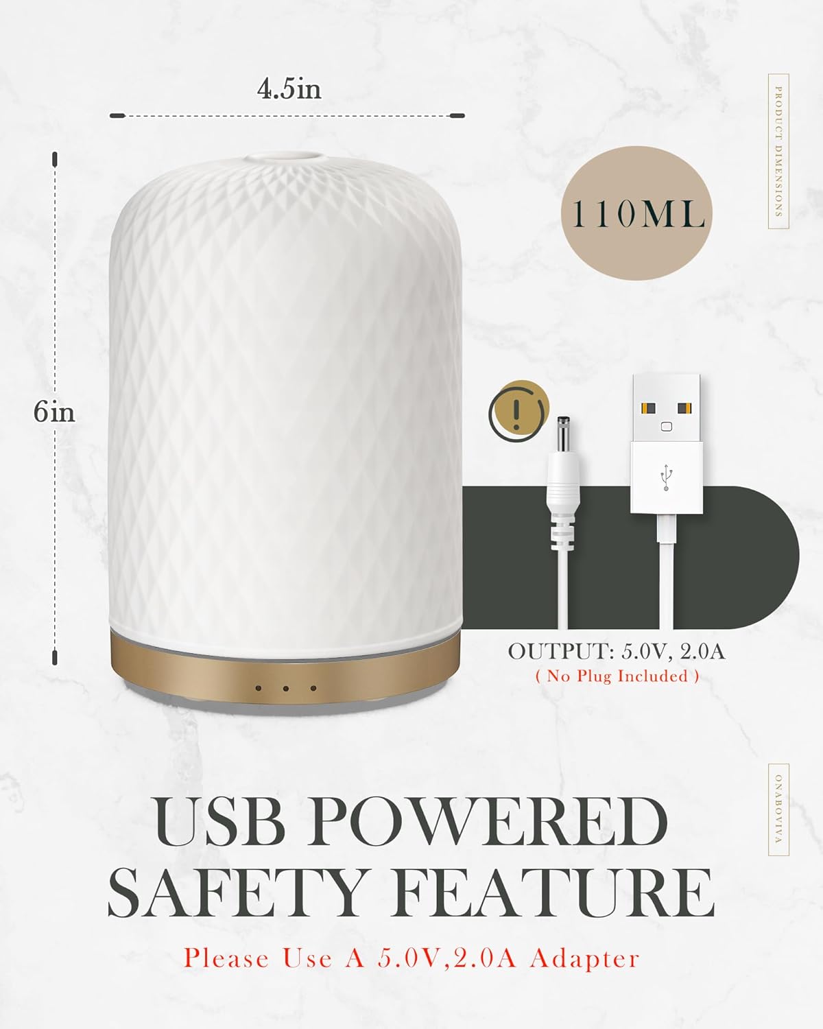 Essential Oil Diffuser,110ML Diffusers for Essential Oils Large Room, Ceramic Diffusers USB Powered Decorative Ultrasonic Defuzzer, Ideal for Aesthetic Home,Dorm Décor, Yoga,White