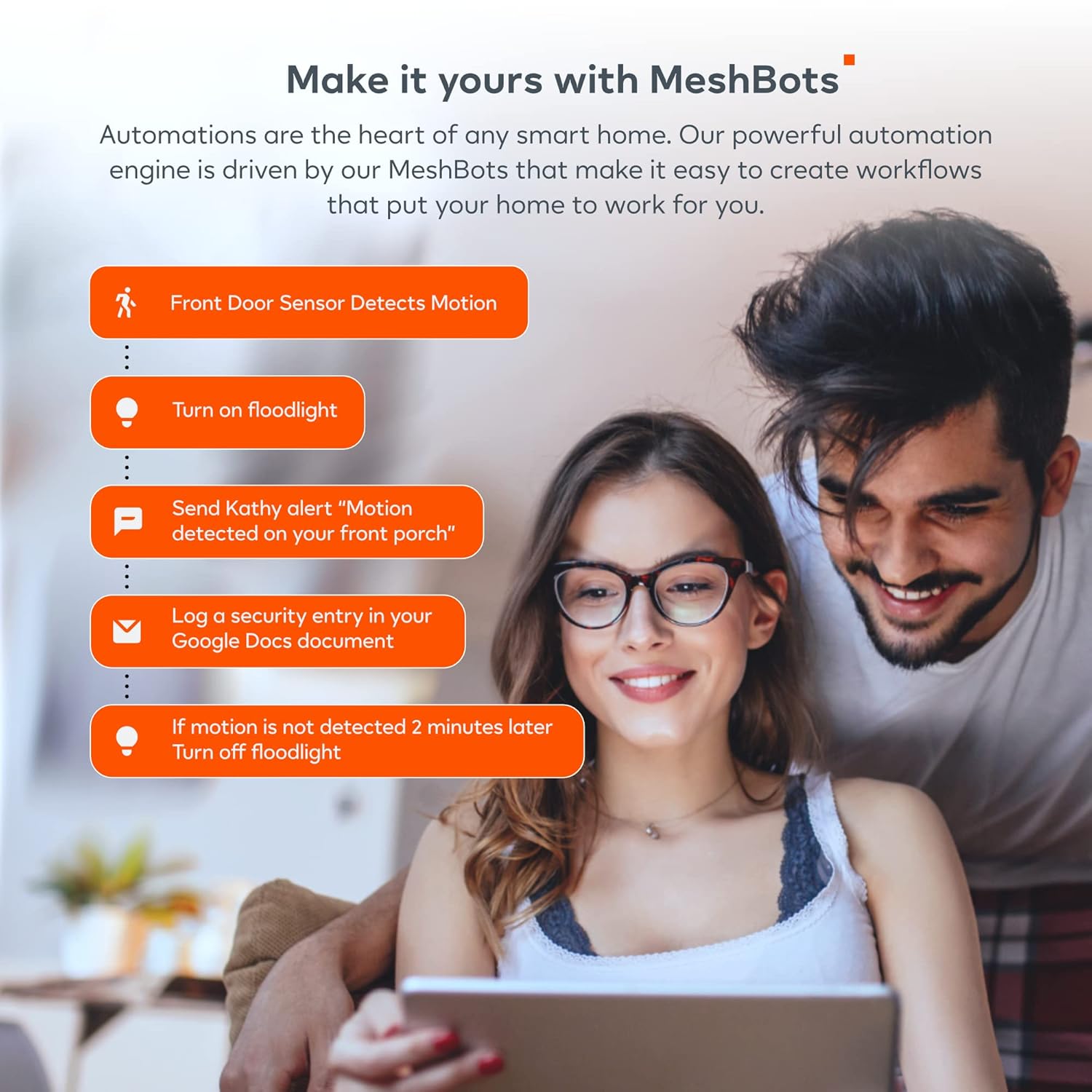 Full control: Coordinate and automate a wide array of smart devices, including video doorbells, sensors, smart lights, smart cameras, smart door locks, and much more from most manufacturers.