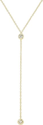Faire de la Mode 14k Gold Plated Sterling Silver Lariat Necklace with 2 Cubic Zirconia in a 3.25″ Dainty Drop Pendant, 16″ – 19″ Gold Plated Sterling Silver Long Necklace for Women